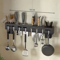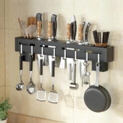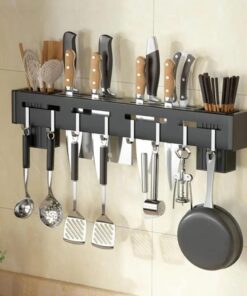 - 2 EASY INSTALLATION METHODS: The pan hanging holder for kitchen offers two mounting options – Self-adhesive & Screw drilling. This kitchen shelf knife rack with towel hanger is easy to wall mount on any smooth and clean surface using: Self-adhesive wall stickers hooks, no drill or screws and hooks