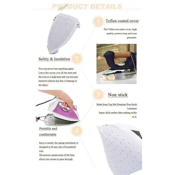 Protect your clothes and extend the life of your iron with this Teflon Iron Shoe Cover. Designed to fit most steam irons, this heat-safe Teflon ironing shoe prevents scorching, sticking, and shine on delicate fabrics. The non-stick surface allows for smooth gliding over garments while distributing heat evenly for professional-quality results.